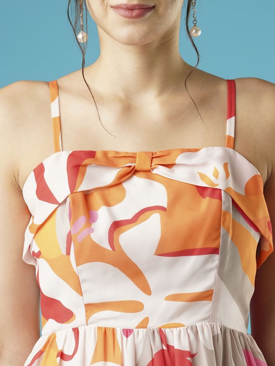 Floral Print Square Neck Shoulder Straps Bow Design Panelled Fit & Flare Midi Dress