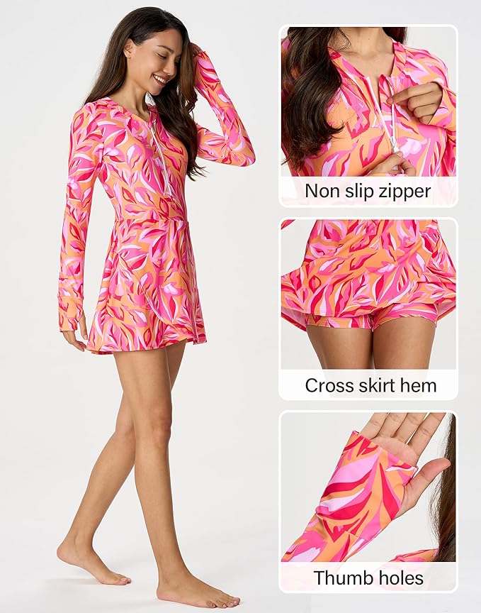 - One Piece Rash Guard Swimsuit:Sun Protection fabric with UPF 50+ well defend your skin from harmful ray.Long sleeves perfectly protect you from being stinging or scratched. High chlorine resistance without compromising on elasticity and wearability.